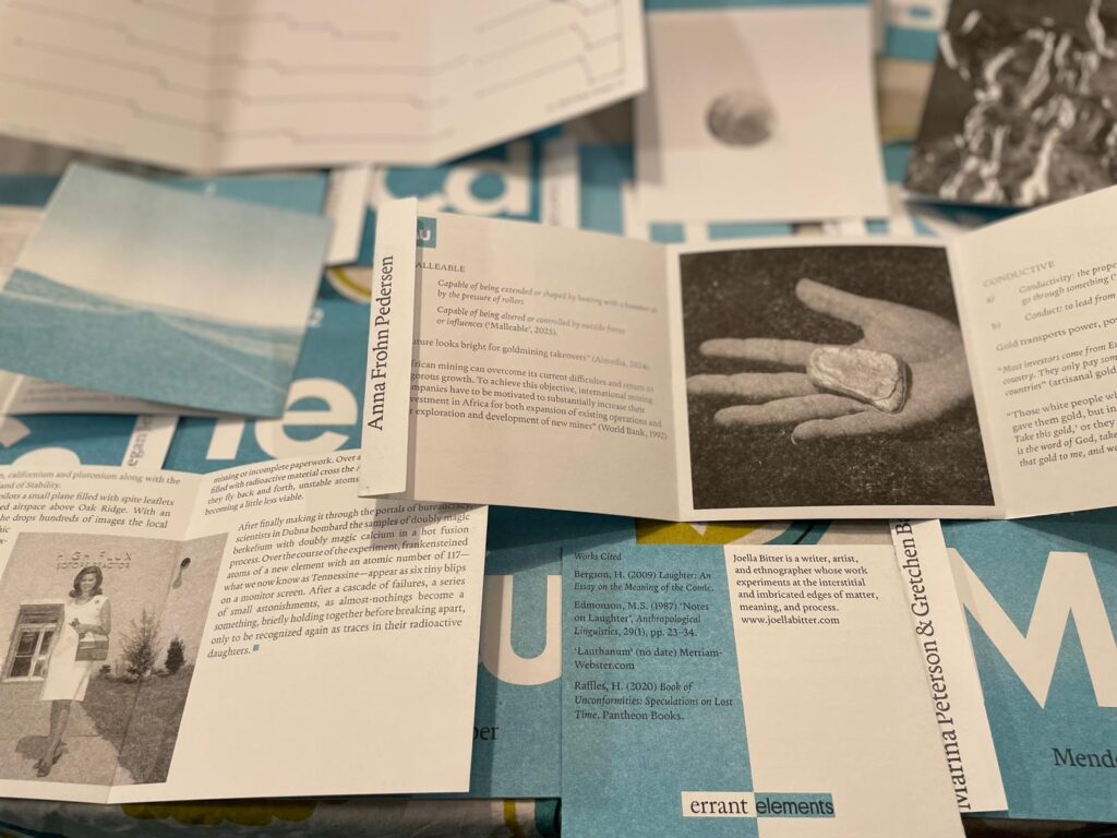 The form – 118 folded chapbooks designed to be combined in various ways – supports a collective exploration of the combinatory affordances and stories of the elements. The format is a 5×5” trifold brochure that folds into a square. This allows readers to connect pieces in different ways, constructing official or imagined elements and reading across diverse entries in ways that open new imaginaries.